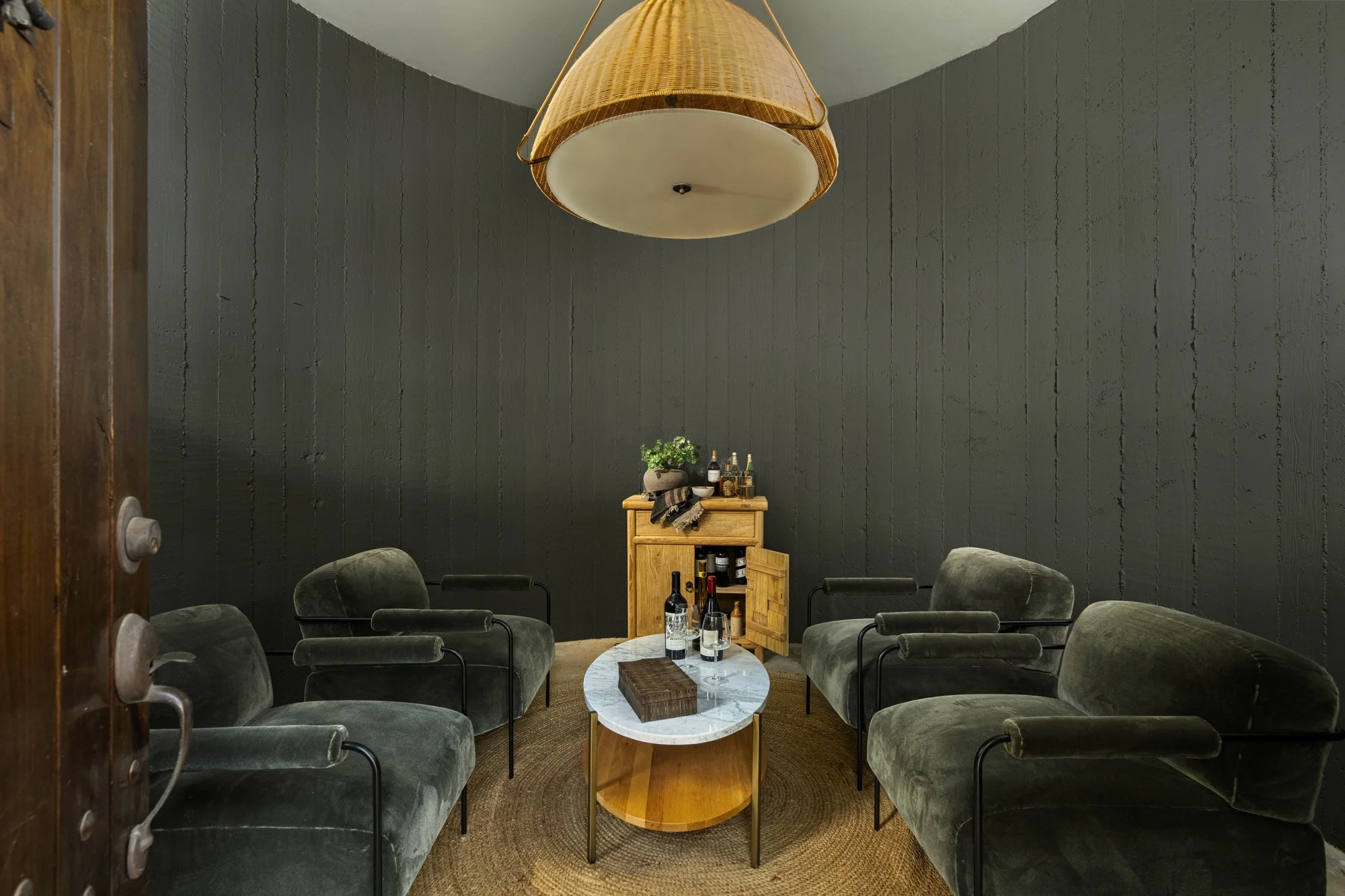 One of the home’s most enchanting features is the private wine cellar and tasting room—accessed through a dramatic stone archway below the main level. Surrounded by concrete walls, it’s a cozy, intimate space perfect for lingering evenings with friends, a treasured bottle, and stories that go late into the night.